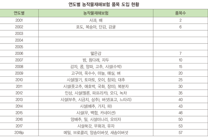 농작물 재해보험 대상 품목도 지난해 53개 품목에서 올해 4개 품목(메밀, 브로콜리, 양송이버섯, 새송이버섯)을 추가하는 등 57개 품목으로 확대하고, 오는 2022년까지 67개 품목으로 확대할 계획이다. 또 자연재해에 취약한 노지작물(배추, 무, 수박 등)을 중심으로 2019~2020년에 도입할 신규 품목을 올 하반기에 일괄 선정한다.