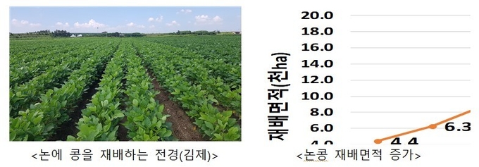 농진청은 이를 뒷받침하기 위해 논에서 벼만큼 재배하기 쉽고 기계 재배가 수월한 콩 품종 ‘선풍’, ‘대찬’ 등을 개발해 현장에 보급하는 데 주력해 왔다. 그 결과 2016년 4422헥타르였던 논콩 재배면적은 2023년 1만8314헥타르로 4.1배 확대됐다.