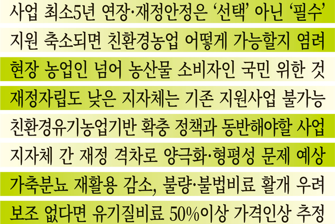 2027년부터 유기질비료 지원사업에 중앙 정부의 예산을 투입해야 한다는 제도적 근거가 사라져 사업 축소나 폐지 우려가 대두되고 있다. 이에 농업인단체와 유기질비료생산단체 등이 국회 토론회를 통해 ‘지원사업의 지속과 현 제도 최소 5년 연장’을 주장하며 의견을 모았다.