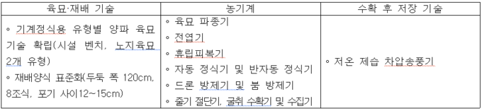 이날 성과공유회에서는 ∆기계 정식용 양파 육묘 기술과 표준 재배 기술 ∆육묘에서부터 수확까지 양파 재배 전 과정 기계화 기술 ∆수확 후 저장 기술 등 양파 생산 전반을 아우른 종합 기술이 소개, 전시됐다.