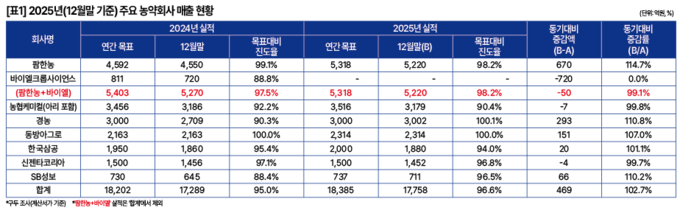 또한 △농협케미컬(아리 포함)은 2025년도에 3,179억 원의 매출을 올리는데 그쳐 전년(3,186억 원) 대비 0.2%(7억 원) 줄었고, △신젠타코리아도 2024년(1,456억 원) 대비 0.3%(4억 원) 감소한 1,452억 원의 매출에 머물렀다.