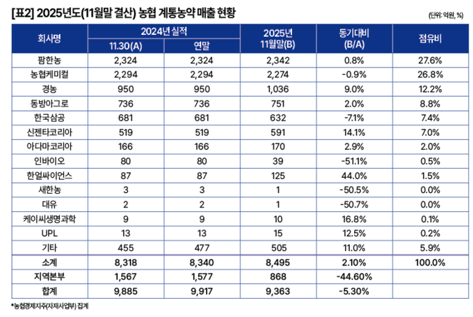 농협 계통농약 매출은 외형상 역성장을 기록했다. 농협경제지주가 집계한 ‘2025년도 농협 계통농약 매출 현황’[표2]에 따르면, 농협조직의 농약 매출총액은 9,363억 원으로 전년 동기(9,885억 원)보다 5.3% 감소했다.