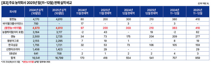 농약 회사별 2025년 11~12월 매출액을 비교[표3]해 보면, 농협케미컬(62억 원)·동방아그로(19억 원)·신젠타코리아(29억 원)·SB성보(3억 원)는 통상적으로 큰 변동 없이 횡보하는 수준을 유지했다. 반면 팜한농(410억 원)·경농(277억 원)·한국삼공(159억 원)은 업계의 통상 범위를 크게 웃돌았다.
