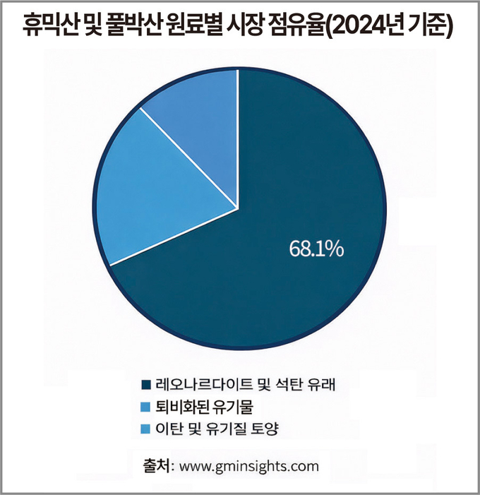 원료 측면에서는 레오나르다이트(leonardite)와 석탄 유래 자원이 핵심 공급원으로 꼽힌다. 이들 원료 시장은 2024년 약 9억 2,010만 달러 규모에 달했다. 높은 부식화 수준과 안정적인 품질을 바탕으로 농업용 생물활성제와 토양 개량제 시장 확대를 이끌고 있다. 북미와 유럽 등지의 매장량은 높은 탄소 함량과 우수한 성능으로 농업 및 환경 분야에 널리 사용되고 있으며, 작물활성제(biostimulant) 및 토양 개량제 제품의 시장 확대를 촉진하고 있다.