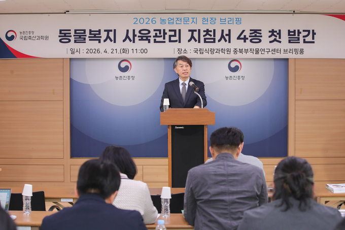 조용민 농촌진흥청 국립축산과학원장은 21일 농업전문지 현장브리핑에서 “축산농가가 동물복지 사육 기술을 쉽게 적용할 수 있도록 동물복지 사육관리 지침서 4종을 처음으로 발간했다”고 밝혔다. 이번 지침서는 국립축산과학원(이하 축과원)이 학계·산업계와 협력해 그동안 축적한 연구 성과와 현장 기술을 바탕으로 동물복지 축산농장 인증 기준을 알기 쉽게 풀어 수록했다.