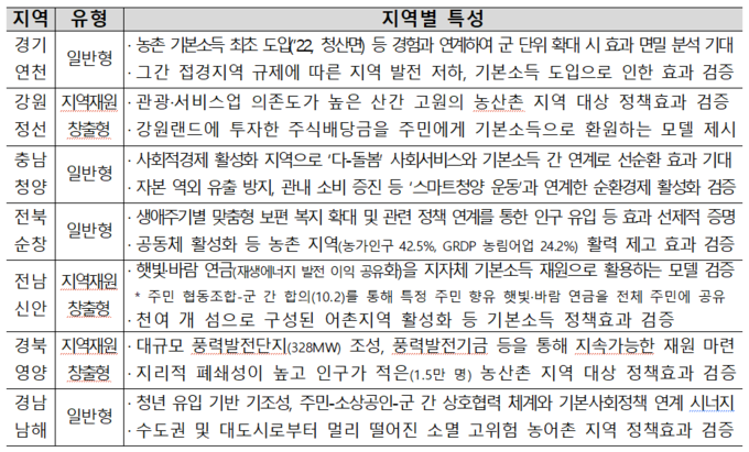 시범사업 지역 선정 기준은 지역 소멸위험도 및 발전 정도, 지자체 추진계획의 실현 가능성, 기본소득과 연계한 성과 창출 계획 등을 종합적으로 고려하였다. 특히 이번 시범사업은 다양한 농어촌 여건에 맞는 유형별 효과를 검증한다는 측면을 고려하여 조례제정 여부, 유사 정책 시행 경험 등 도입 의지와 정책적 역량 등 시범사업 종료 이후 지속가능성에 주안점을 두었다.