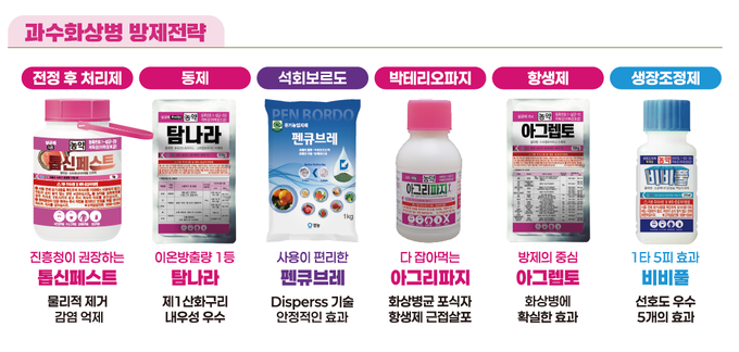 신초가 발아하기 직전에는 세균 번식이 빠르게 증가하는 특성을 나타내며, 이 시기에는 ‘탐나라(동제)’를 적용해 세균 증식을 억제하고 초기 조직의 감염을 예방한다. 또한 올해 출시한 ‘펜큐브레’는 동절기 처리하는 석회보르도액으로 동제보다 안전하고 입상수화제 제형으로 기존 제품보다 사용이 편리해 농가들로부터 많은 호평을 받고 있다.