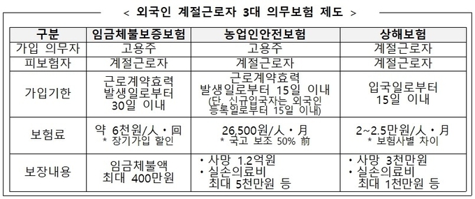 농림축산식품부는 외국인 계절근로자 3대 의무보험(임금체불보증보험·농어업인안전보험·상해보험)에 대해 오는 2027년 2월 14일까지 1년간 계도기간을 둔다고 밝혔다. 이번 제도는 ‘농어업고용인력 지원 특별법’ 개정에 따라 지난 2월 15일부터 시행됐다.
