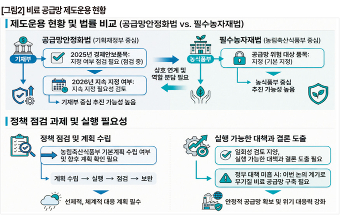 이번 위기 사태는 수급 불안뿐 아니라 법·제도 공백도 함께 드러냈다는 평가다. 현재 무기질비료(요소)는 「경제안보를 위한 공급망 안정화 지원 기본법(공급망안정화법)」상 ‘경제안보 품목’으로 2025년 지정됐다. 그러나 2026년 지속 지정 여부가 불분명하고, 이 법에 기반한 농식품부 차원의 기본계획도 수립되지 않은 것으로 파악됐다. [그림2]