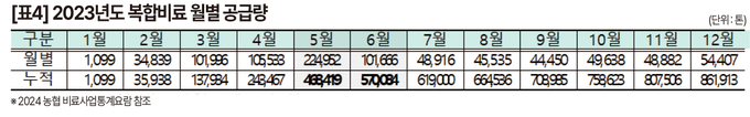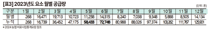 비료협회 데이터를 인용하면, 요소는 상반기 약 60%, 하반기 약 40%를 공급하는 구조다. 현재 추세대로라면 요소와 복합비료 모두 5~6월 중 현 재고가 소진될 것으로 예상된다. 하반기 농업 시즌을 앞두고 ‘공급 절벽’이 현실화할 수 있다는 경보가 켜진 셈이다.[표3][표4]