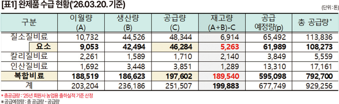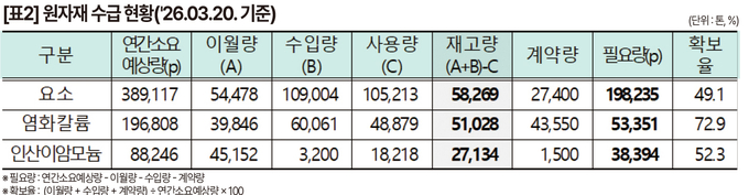 한국비료협회가 발표한 ‘비료 완제품 및 원자재 수급 동향’에 따르면, 지난 3월 20일 현재 연간 소요 예상량 대비 요소 원자재 확보율은 49.1%에 그치고 있다. 요소 재고는 5만 8,269톤으로 전주 대비 13.3% 감소했고, 수입 필요량은 19만 8,235톤이 남아 있다.[표1][표2]