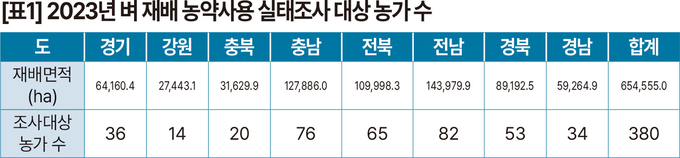 한국농자재시험연구기관협회(KARO)는 2023년도 벼 재배기간 동안 농약사용실태를 조사하기 위해 8개도 58개 시군의 주요 생산지에서 380농가를 선정했다고 밝혔다.[표1]