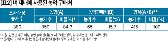 조사 결과에 의하면, 대상 농가의 84.3%가 지역농협에서, 15.7%가 시중 농약판매상에서 농약을 구입하는 것으로 나타났다.[표2] 농협과 시판의 전체 농약유통비율이 6:4 정도임을 감안하면, 정부와 자체 지원사업이 지난한 원예용 약제의 감소분이 투영되지 않은 결과로 풀이된다.