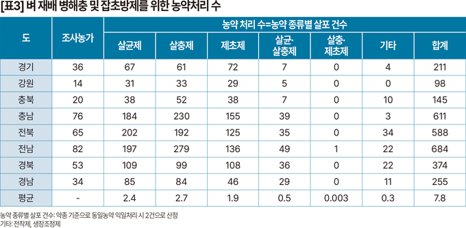 ‘벼’ 살포횟수 7.8회 중 살충제 2.7회로 가장 많아