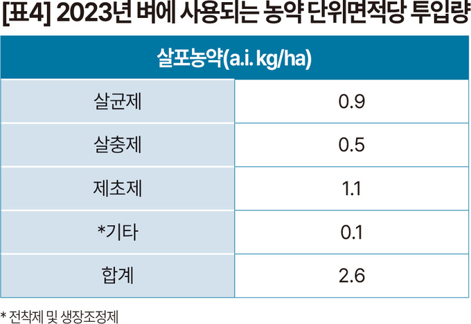이는 같은 해인 2023년도 수도용 약제 전체 출하량 2만402톤 대비 13.7%인 2786톤과, ha당 화학농약 사용량인 10.1kg을 감안할 때 실제 수도용 약제의 사용량은 25% 수준에 그쳐 매우 적은 양임이 증명된 셈이다.