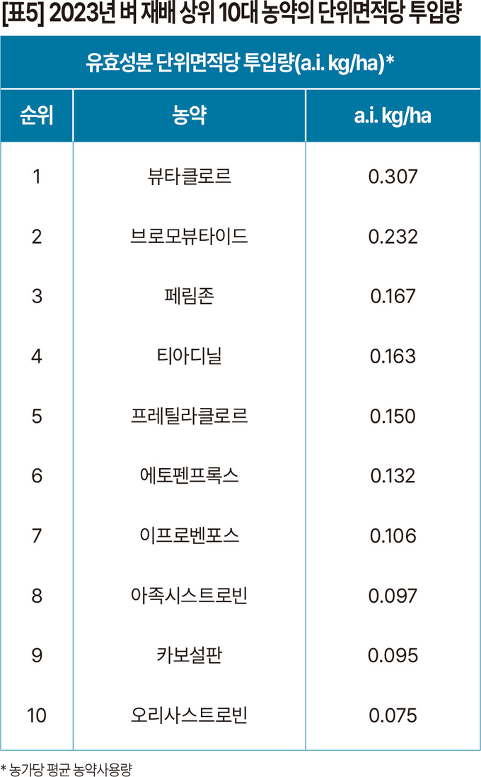 한편, 벼 재배에는 모두 107가지 유효성분을 함유한 269종의 농약이 사용되었는데 사용량 순으로 상위 10대 약제를 보면 뷰타클로르, 브로모뷰타이드, 페림존, 티아디닐, 프레틸라클로르, 에토펜프록스, 이프로벤포스, 아족시스트로빈, 카보설판, 오리사스트로빈 순으로 많이 사용한 것으로 조사됐다.[표5]
