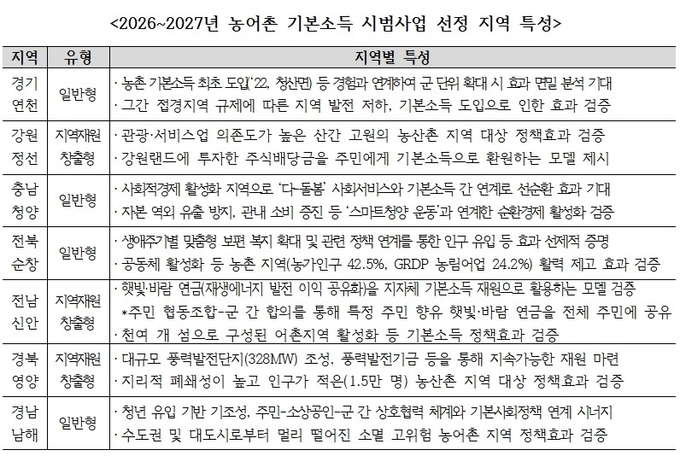 농어촌 인구감소 지역에 기본소득을 지급하는 2026~27년 시범사업에 7개 군(연천·정선·청양·순창·신안·영양·남해)이 선정됐다.