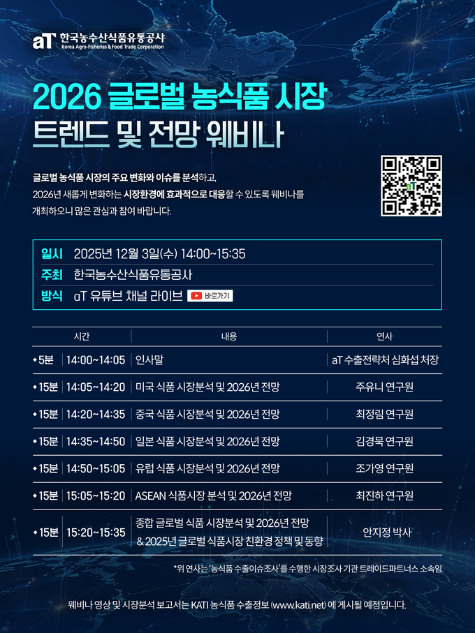 ‘2026 글로벌 농식품 시장 트렌드 및 전망 웨비나’는 aT 공식 유튜브 채널을 통해 다시 시청할 수 있으며, 관련 자료는 농식품수출정보 누리집 ‘카티’(kati.net)에서 확인할 수 있다.