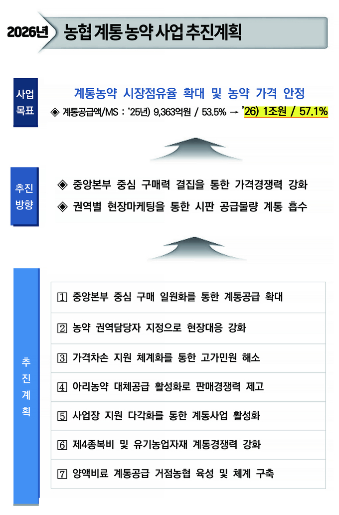 농협경제지주의 올해 계통농약사업 세부 추진계획에 따르면, 먼저 중앙본부 중심 구매 일원화를 통한 계통공급 확대에 집중하기로 했다. 지역본부 계통 성장에 따른 중본계통 사업이 정체되고 시판상 가격교란 행위가 성행함에 따라 ‘시판공급물량 500억 원 이상을 중앙본부 계통으로 흡수’ 한다는 목표다.
