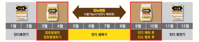 ‘모뉴먼트 입제’의 권장 사용 시기는 3월 초~4월 초 한식 무렵과 9월 초~추석 전 벌초 또는 예취 후 시기로 안내했다. 입제 형태 특성상 살포 과정이 비교적 단순해 반복 관리 부담을 덜어주는 것도 장점이다.