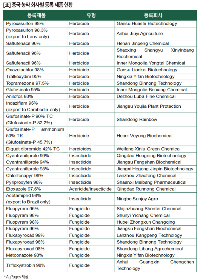 이번 등록 결과에 비춰볼 때 중국 농약 산업은 식량안보 중심의 내수 대응과 동시에 수출 확대 전략을 병행하고 있음을 알 수 있다. 곡물 중심 등록 확대는 대규모 농업 생산 기반을 뒷받침하기 위한 정책적 흐름과 맞물려 있으며, 수출 전용(EX) 등록 증가는 동남아·중남미 등 신흥 시장 공략을 위한 공급 능력 강화로 해석된다. 혼합제와 고함량 원제 중심의 등록 증가는 기술 경쟁 심화와 글로벌 시장 점유율 확대 전략을 반영한다는 평가다.