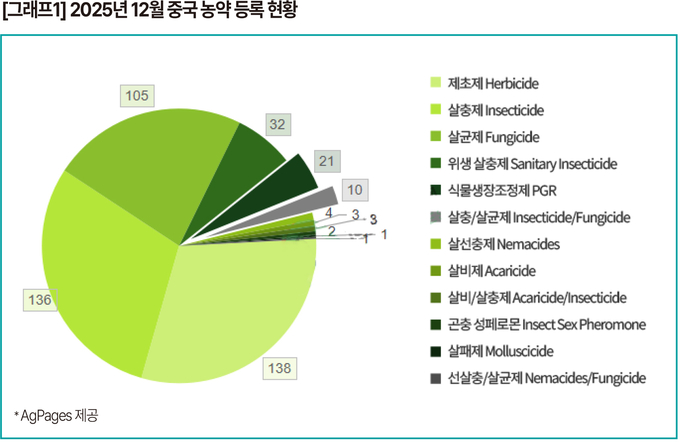 중국 농업농촌부 산하 농약검정소(ICAMA)에 따르면, 2025년 12월 10일부터 31일까지 20여일 사이에 총 456개 농약 제품이 정식 등록됐다. 이번에 등록된 농약 제품은 원제 30종(수출 전용 3종 포함)과 제품 426종이 포함됐다. [그래프1]