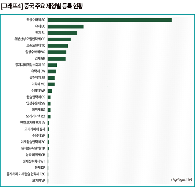 제품 유형별로는 액상수화제(SC)가 172건으로 전체의 37.72%를 차지해 가장 많았다. 이어 유제(EC) 50건(10.97%), 액제(SL) 40건(8.99%) 순이었다. 이 밖에 입상수화제(WG), 입제(GR), 유탁제(EW), 유현탁제(SE) 등 다양한 제형이 각각 10건 이상 등록되며 제품 형태의 다양화가 진행 중이다. 고효율·저독성 제형 중심으로 시장이 재편되는 흐름이다. [그래프4]