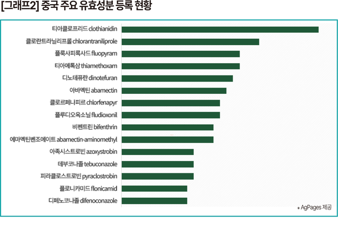 이 밖에 디노테퓨란(dinotefuran), 아바멕틴(abamectin), 클로르페나피르(chlorfenapyr), 플루디옥소닐(fludioxonil), 비펜트린(bifenthrin), 에마멕틴벤조에이트(emamectin benzoate), 아족시스트로빈(azoxystrobin), 테부코나졸(tebuconazole), 피라클로스트로빈(pyraclostrobin), 플로니카미드(flonicamid), 디페노코나졸(difenoconazole) 등도 각각 10건 이상 등록됐다. 범용 살충·살균 성분 중심의 등록 확대는 중국 농약 시장에서 기존 핵심 성분 경쟁이 지속되는 반증으로 여겨진다. [그래프2]