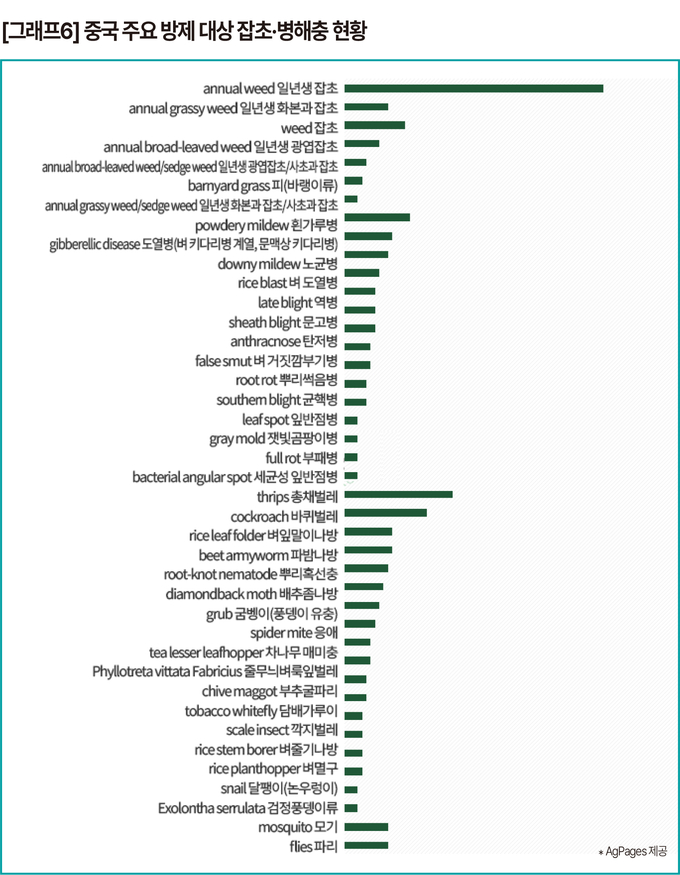 방제 대상은 제초제의 경우 일년생 잡초와 화본과·광엽잡초, 피, 사초류 등이 중심이었다. 살충제는 진딧물·총채벌레·벼멸구·나방류·응애류·뿌리혹선충·흰개미·모기·파리 등 주요 농업 및 위생 해충을 겨냥했다. 살균제는 흰가루병·노균병·도열병·탄저병·잿빛곰팡이병·녹병·뿌리썩음병 등 주요 병해 방제용이 다수를 차지했다. [그래프6]