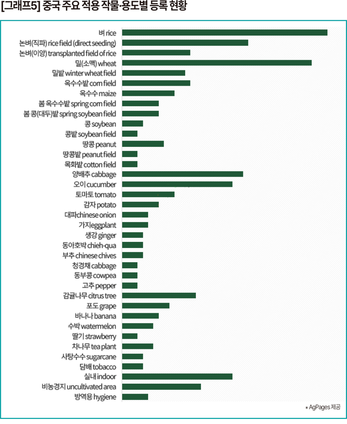 작물 적용 분야에서는 식량작물이 가장 큰 비중을 차지했다. 벼, 직파·이앙 벼, 밀, 옥수수, 대두, 땅콩, 면화 등 주요 곡물 및 유지작물용 등록이 대거 포함됐다. 채소류에서는 배추·오이·토마토·감자·고추·생강·가지·부추·청경채 등 다양한 품목이 대상에 포함됐고, 과수는 감귤·포도·바나나·수박·딸기 등으로 확대됐다. 차나무·사탕수수·담배 등 고부가가치 작물과 비농경지·위생용 등록도 일부 포함됐다. [그래프5]