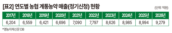 그동안 농협 계통농약 사업은 지속적인 증가세를 보여 왔다. 신청금액(순수아리 포함) 기준으로 지난 △2013년 5,388억 원에서 △2014년 5,854억 원 △2015년 5,857억 원 △2016년 6,146억 원 △2017년 6,204억 원에 이어 △2018년에도 6,559억 원으로 꾸준한 증가세를 보였다. 다만, △2019년에는 계통농약 가격이 대폭 인하하는 등의 영향으로 전년 대비 138억 원이 줄어든 6,421억 원을 기록했다. 하지만, △2020년 들어 6,696억 원으로 급반등했던 여세를 몰아 △2021년에는 계통농약 정기신청 유사 이래 처음으로 7,000억 원대를 넘어선 7,090억 원으로 마감했다. 뒤이어 △2022년 7,797억 원 △2023년 8,626억 원 △2024년 8,985억 원(순수아리 108억원을 제외한 신청금액은 8,877억 원), △2025년 8,994억 원을 기록했으며, △2026년에는 9,279억 원으로 최종 집계됐다. [표2]