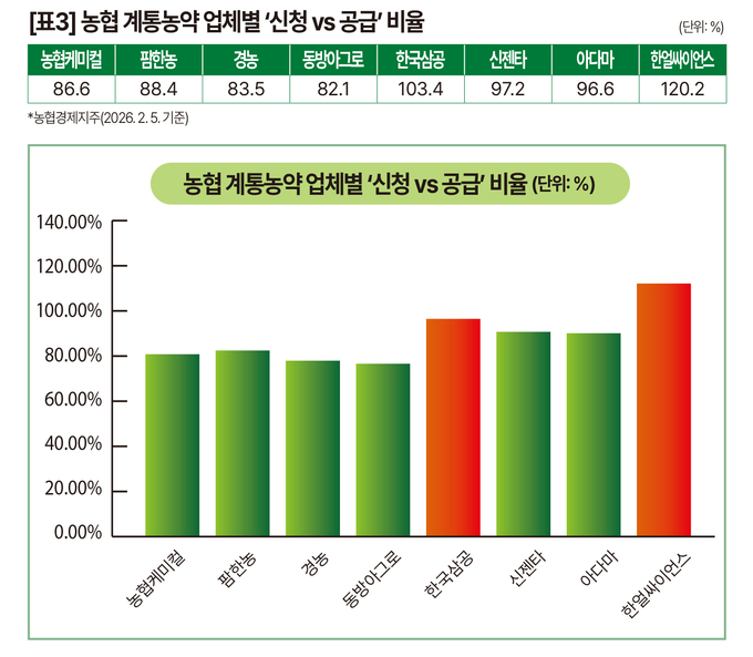 그러나 메이저 회사들의 2025년 ‘신청 vs 공급’ 실적을 보면, 한국삼공과 한얼싸이언스를 제외한 나머지 회사들의 실제 공급 실적(금액)은 정기신청 금액을 따라잡지 못했다. [표3] 지난해 농협 계통공급 회사별 정기신청 대비 공급 비율[그래프]을 보면, △농협케미컬 86.6% △팜한농 88.4% △경농 83.5% △동방아그로 82.1% △한국삼공 103.4% △신젠타코리아 97.2% △아다마코리아 96.6% △한얼싸이언스 120.2% 등으로 나타났다.