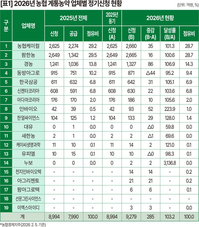 농협경제지주가 정기신청 마감일인 이달 5일 최종 집계한 ‘2026년 계통농약 정기신청 현황’[표1]에 따르면, 농협 계통공급 참여 19개 업체의 신청 총액은 9,279억 원으로 지난해 같은 기간보다 285억 원(3.2%) 증가했다. 특히, 올해는 신규 5개 제조사(천지인바이오텍, 아그리젠토, 팜아그로텍, 선문그린사이언스, 이엑스아이디)가 계통공급에 참여해 44억 원의 정기신청 금액을 보탰다.