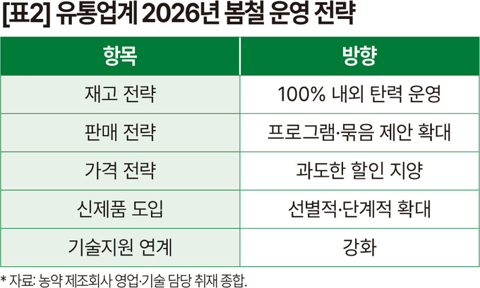 고가 신제품은 초기 소량 확보 후 농가 반응을 보고 확대하는 방식이 일반화되고, 과도한 할인 경쟁보다는 프로그램 판매를 통한 객단가(客單價)를 유지하려는 기조도 뚜렷해 보인다. [표2]