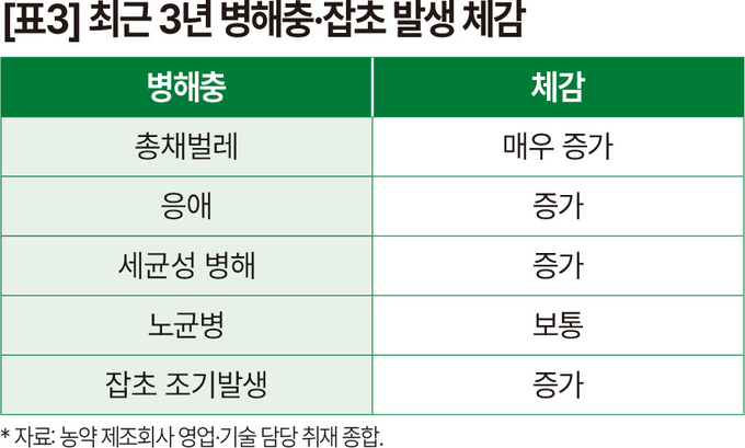 최근 병해충 발생 양상은 분명한 변화를 보이고 있다. 시설채소에서는 총채벌레와 응애 발생이 증가하고 있고, 과수에서는 예방 중심의 살균제 수요가 꾸준히 이어지고 있다. 잡초 조기 발생 또한 논 제초제 출하 시점을 앞당기는 요인으로 작용하고 있다. [표3]