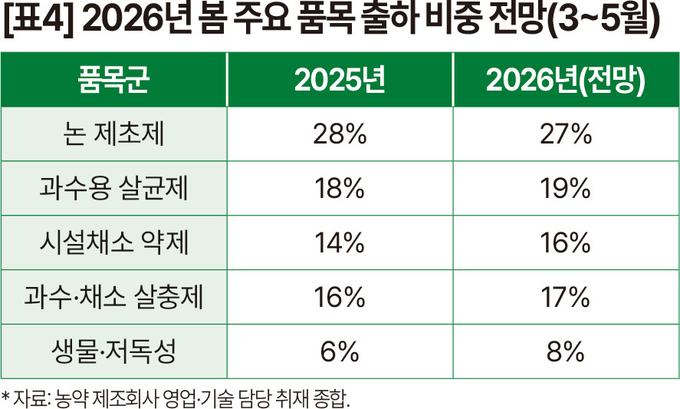 올해 봄철 출하는 논 제초제가 중심이지만 시설채소와 과수용 약제 비중도 소폭 확대될 전망이다. [표4] 병해충 조기 발생 가능성과 예방 방제 강화 흐름이 반영된 결과로 보인다.