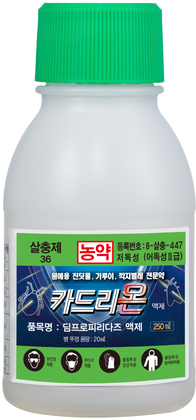 농협케미컬 ‘카드리온’ 액제는 신규물질 딤프로피리다즈를 이용해 작용기작 36에 분류되는 신규계통 살충제로서 진딧물, 가루이, 깍지벌레 등 흡즙성 해충 전문 약제다. 곤충의 현음기관에 간접적으로 작용해 활동성을 둔화시켜 치사시킨다.
