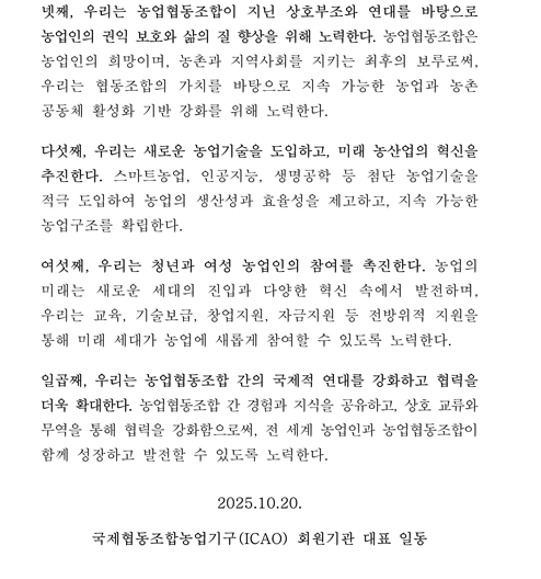강호동 회장은 “ICAO 서울 선언문은 농업의 가치와 지속가능한 미래를 만들고자 하는 전 세계 농업인들의 염원을 담은 것”이라며, “한국 농협은 국제 농업협동조합들과의 연대 강화를 통해 우리의 농업·농촌을 지켜나가기 위해 최선을 다 할 것”이라고 의지를 표명했다.