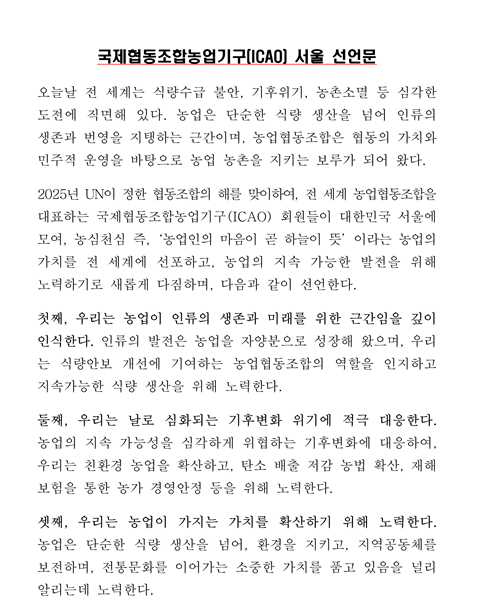 ‘ICAO 서울 선언문’은 총 7개의 핵심 의제로 ▲식량안보 강화 ▲기후위기 대응 ▲청년·여성 농업인 육성 ▲농업가치 확산 ▲농업인 권익보호 ▲첨단 농업기술 도입 ▲협동조합 간 연대 강화를 담고 있다. 협동조합이 농업과 농촌, 나아가 인류의 지속가능한 발전을 선도하는 사회적 주체임을 전 세계에 천명한 역사적 선언이었다.