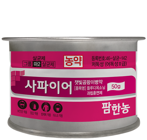시설작물의 잿빛곰팡이병 전문약으로, 예방 효과가 우수하며 기존 약제들과 교차 저항성이 없다. 훈연 처리 방식으로 사용이 매우 간편하며, 처리 시간이 짧고 빠르게 건조돼 온실 내 습도 상승 및 2차 병 발생을 방지한다. 과실에 약흔이 남지 않아 농작물의 상품성 향상에도 유리하고, 잔류에 안전해 연속수확 작물에도 걱정 없이 사용할 수 있다. 딸기, 오이, 고추, 호박, 장미 등 주요 시설작물의 잿빛곰팡이병에 등록됐다.