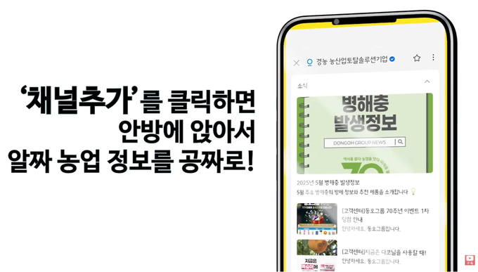 경농 카카오톡 채널에서는 △병해충 방제 정보, △작물별 관리 방법, △신제품 정보, △재배 기술 콘텐츠 등 농업인이 가장 많이 찾는 핵심 정보를 알림 형태로 실시간 제공하고 있다. 농업인이 직접 검색하지 않아도, 재배 시점에 꼭 필요한 농업 정보를 제공하는 실전형 채널로 그 활용도가 더욱 높아질 전망이다.