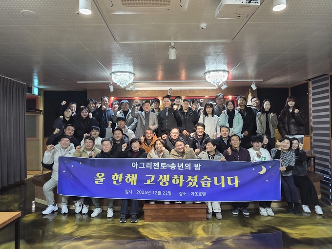 작물보호제 제조 전문기업 아그리젠토(주)(대표 진남수)가 이달 22일, 경남 거창 가조호텔에서 본사 및 공장 임직원 44명 전원이 참석한 가운데 ‘2025년 송년의 밤’ 행사를 성황리에 개최했다. 이번 행사는 임직원들의 노고를 치하하고 다가오는 새해의 비전을 공유하며 결속을 다지는 뜻깊은 자리였다.