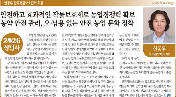 한국작물보호협회는 앞으로도 기업의 사회적 책임을 다하며, 농업인 여러분의 든든한 동반자로서 여러분 곁을 지키겠습니다. 변함없는 지지와 격려를 부탁드립니다. 새해 복 많이 받으십시오.