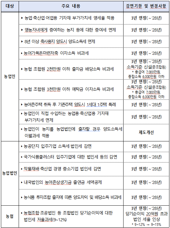 <2025년 일몰 도래 농업분야 국세 특례 연장 및 제도개선 사항>