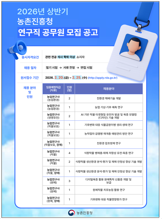 농촌진흥청(청장 이승돈)이 2026년도 연구직 공무원 20명을 경력경쟁채용시험을 통해 선발한다.