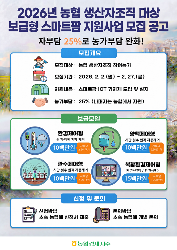 농협은 오는 27일까지 ‘2026년 농협 생산자조직 대상 보급형 스마트팜 지원사업’ 참여 농가를 모집한다고 10일 밝혔다. 보급형 스마트팜은 하우스와 과수원 등 기존 영농시설에 스마트 제어 장비를 설치하는 농협형 스마트팜 모델이다.