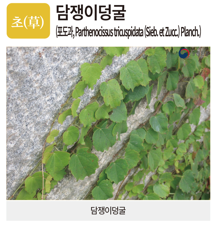 형태=길이는 10m이상이다. 줄기는 낙엽활엽의 넌출성 목본으로 돌담, 바위 또는 나무줄기에 붙어서 자란다. 덩굴손은 잎과 대생하고 갈라져서 끝에 흡반(吸盤)이 생긴다. 잎은 호생하고 넓은 난형으로 길이와 나비가 모두 5~20㎝이다. 다형(多形)이고 많은 것이 끝에 3개로 얕게 갈라지나 때로 3출 장상복엽이며 가장자리에 불규칙한 톱니가 있다. 잎 뒤 맥 위에 잔털이 있으며 엽병이 길다.