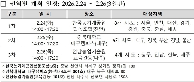 권역별 일정은 24일 천안 한국농기계공업협동조합을 시작으로 25일 대구 경북대, 26일 전남 나주 전남농업기술원에서 진행된다. 각 지역별로 수도권·영남권·호남권 등 인근 시·도 관계자들이 참여해 정책 설명과 질의응답이 이어질 예정이다.