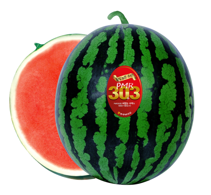 흰가루 내병계 품종인 ‘피엠알303’ 수박은 순뭉침, 순부러짐 증상이 덜하여 재배 용이성이 아주 우수한 품종이다. 호피 단타원형 적육계 품종으로 외관이 수려하며 과 비대력과 과형 안정성이 우수하다.