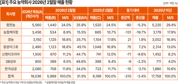 주요 7개 농약회사(팜한농·농협케미컬·경농·동방아그로·한국삼공·신젠타코리아·SB성보)의 2026년 2월 말 매출 총액은 5,989억 원으로, 지난해 같은 기간의 6,199억 원보다 210억 원(-3.4%) 줄어든 것으로 추산됐다.